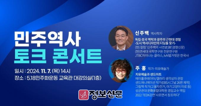 이날 강연에서는 역사학자인 신주백 성공회대학교 교수와 치유예술가 주홍 작가가 ‘광주의 민주역사’를 조명한다.