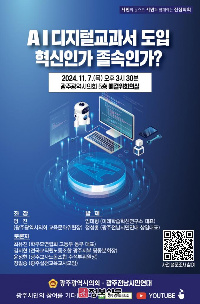 ![]() 광주광역시의회, AI디지털교과서 도입 현실과 방안 마련 정책토론회 개최 |