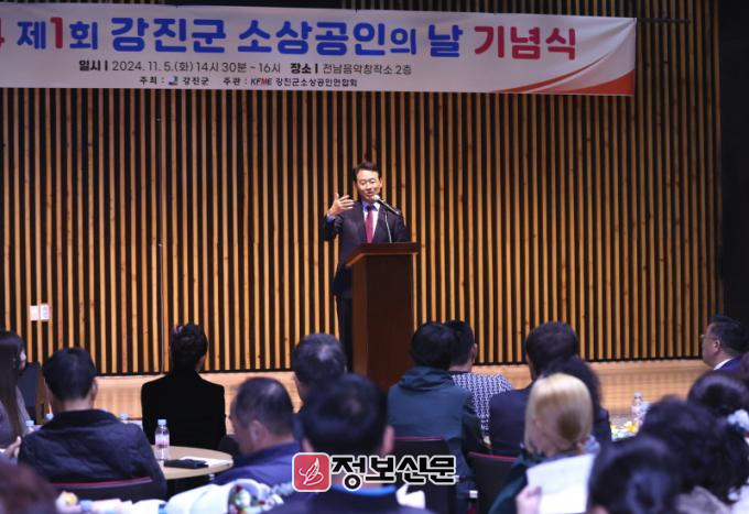 강진원 군수는 ‘제1회 강진군 소상공인의 날’ 기념식을 축하하고, 고물가 고금리 등의 어려움을 버티고 생업을 이겨나가는 소상공인들의 노고를 격려하며, 지역경제의 실핏줄인 소상공인을 위한 지원을 지속적으로 강화하기 위해 지난 6월부터 강진군 소상공인지원센터를 개설했으며, 앞으로도 우리 지역의 소상공인을 위한 지원을 확대할 것 등을 약속했다.