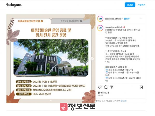 이에 공보실에서는 인스타그램과 카카오톡 채널 등 SNS를 활용, 전 국민을 대상으로 미술관 운영 종료 및 임시 전시 공간 운영 사실을 자연스럽게 알려 나가는 동시에, 이중섭미술관과 함께하는 ‘제주 거주 작가 알리기’ 이벤트를 내놓아 호응을 얻고 있다.