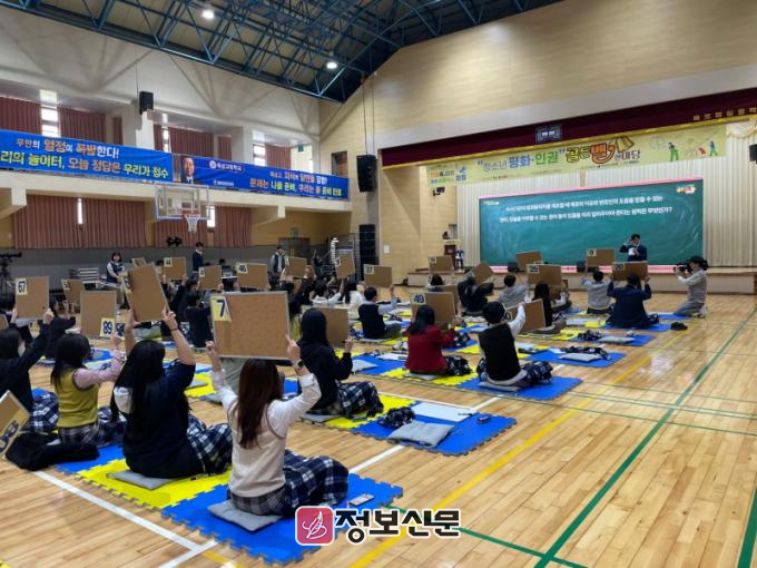 이 행사에는 도내 7개 고등학교에서 선발된 100여 명의 학생들이 참가해, 평화․인권 주제 퀴즈를 풀며 지식을 겨뤘다. 앞서 탈락한 학생들을 위한 패자부활전도 마련돼 골든벨을 울리기 위한 학생들의 열정이 행사장을 가득 메웠다.