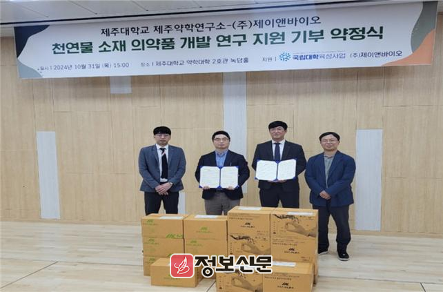 양 기관은 지자체-대학 협력기반 지역혁신사업(RIS)을 통해 발굴한 제주 천연물 자원을 활용해 암 및 자가면역질환을 치료할 수 있는 메디바이오 소재를 개발하고자 지난 10월 31일 업무협약(MOU)을 체결했다. 이는 대학과 지역산업체의 협력을 통해 제주 바이오산업 경쟁력을 높이기 위한 중요한 발걸음으로 평가된다.
