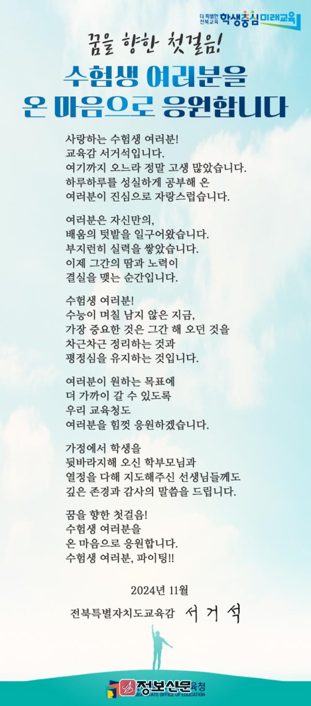 ![]() 서거석 전북특별자치도교육감, 수험생 응원메시지 전해 |