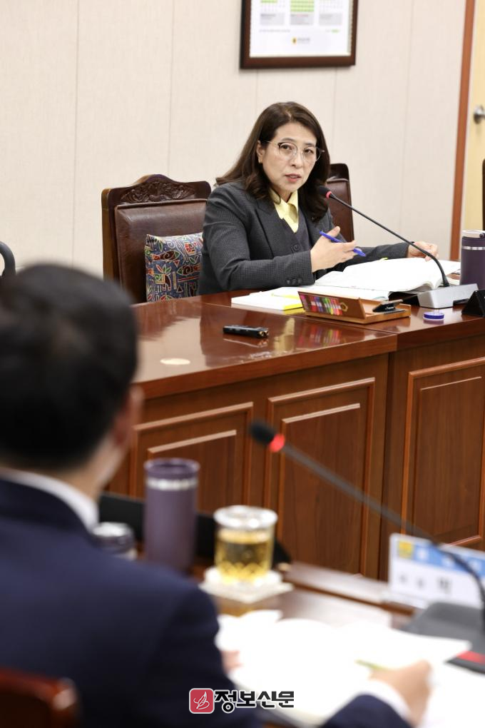 ![]() 전라남도의회 제386회 제2차 정례회 보건복지환경위원회 소관 환경산림국 행정사무감사(5일)에서 김미경 의원이 집행부를 향해 질의하고 있다. |