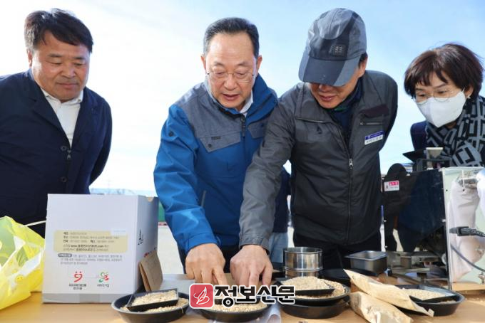 수매현장 점검에 나선 명현관 군수는“폭염과 집중호로 인한 병해충의 발생 등으로 어려움이 가중된 상황임에도 농민들을 포함한 민관이 함께 잘 협력해 농업재해 인정과 특별재난지역 지정 등을 이끌어 냈다”며“어려움 속에서도 값진 수확의 결실을 맺은 농업인들의 노고에 감사드리며, 벼 수매가 원활히 이뤄질 수 있도록 최선을 다하겠다”고 말했다.