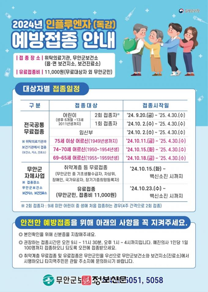 65세 이상 어르신(1959년생까지), 13세 이하 어린이(2011년생까지), 임신부는 주소지와 상관없이 전국의 가까운 지정의료기관이나 무안군보건소, 각 읍․면 보건지소, 보건진료소에 신분증을 갖고 방문하면 무료로 접종받을 수 있다.