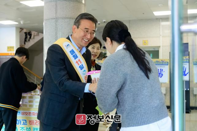 이번 캠페인은 오순문 서귀포시장, 부시장, 국장, 과장 등 간부공직자가 앞장서서 출근하는 직원들에게 먼저 따뜻한 인사를 건네고 상호 존중 5대 실천 과제 등을 홍보하며 직원들을 격려했다.