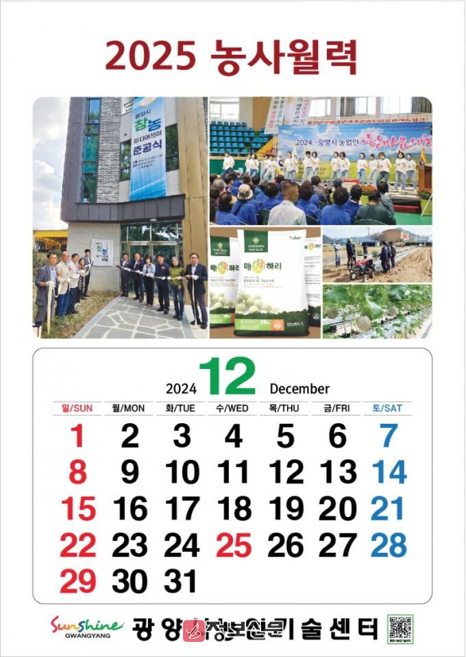 이은희 기술보급과장은 “농사월력을 토대로 농사 일정을 계획하면 시기를 놓치지 않고 영농을 할 수 있다, 광양시청과 농업기술센터 홈페이지로 연결되는 QR코드도 농사월력에 인쇄되어 있으니 많이 이용해보시기를 바란다”라고 말했다.