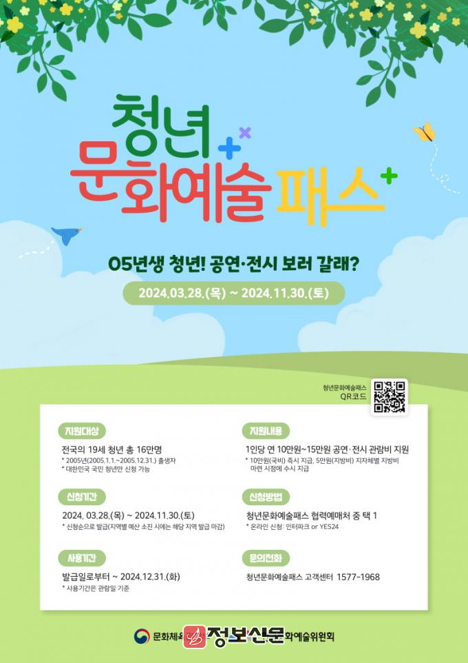 ‘청년문화예술패스’ 사업은 사회에 첫발을 내딛는 청년에게 문화예술 향유 기회를 제공하기 위해 예술 분야 공연(연극·뮤지컬·클래식·오페라·발레·무용·합창·국악 등)과 전시 관람비를 연간 최대 15만 원 지원하며, 올해 최초로 시행하는 사업이다.