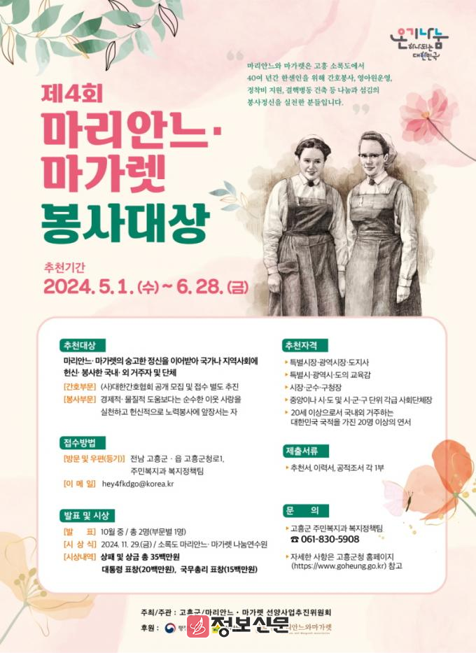 한편, 고흥군은 제4회 마리안느·마가렛 봉사대상 시상식을 오는 11월 29일 소록도 마리안느·마가렛 나눔연수원에서 개최할 계획이다.