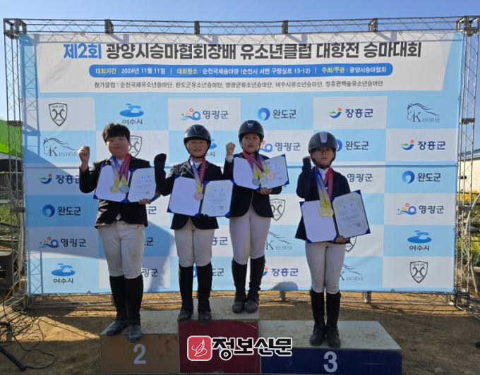 지난 11월 11일 광양시승마협회 주관하에 개최된‘제2회 광양시승마협회장배 유소년 승마클럽 대항전’이 순천국제승마장에서 진행되었다. 5개 시군 유소년 승마단이 참여한 이날 대회에서 영광승마장 유소년 승마단은 영광초등학교 5학년 김지연‧이재후‧박정은 학생, 4학년 신강희철 학생이 출전하여 5개 종목에서 입상하는 성적을 거두었다.