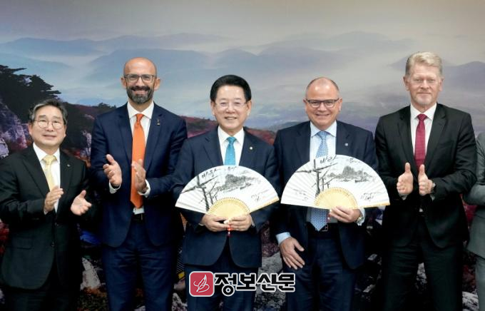 면담 후 해상풍력 터빈이 그려진 전통부채에 김영록 지사와 헨릭 회장이 서명하고 교환하면서 상호 협력 의지를 다졌다.