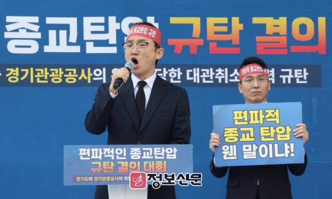 이어 집회 참여자들과 함께 ‘편파행정과 종교탄압을 멈춰라, 정치와 종교를 분리하라, 경기도와 경기관광공사는 사과 및 배상을 하라’는 등의 구호를 외쳤다.
