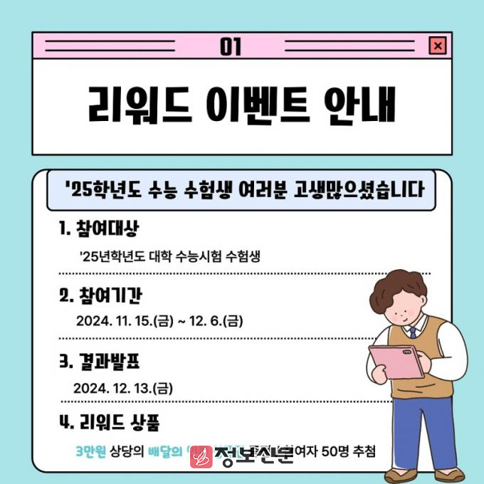 15일부터 12월 6일까지 진행되는 ‘수능 힐링 리워드 이벤트’는 무료로 개방되는 관광지를 방문하여 본인 sns 계정에 방문사진 및 후기를 게시하면 추첨을 통해 3만원 상당의 기프티콘을 지급할 예정이다.