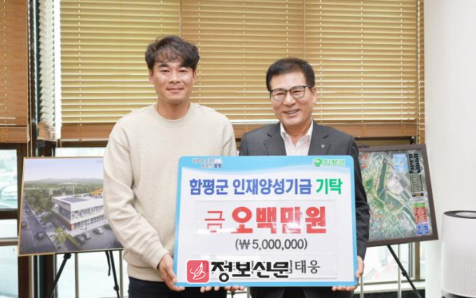 함평군 관계자는 “15일 김태웅(TJ인터피드) 대표가 함평군 인재양성기금에 5백만원을 기탁했다”고 밝혔다.