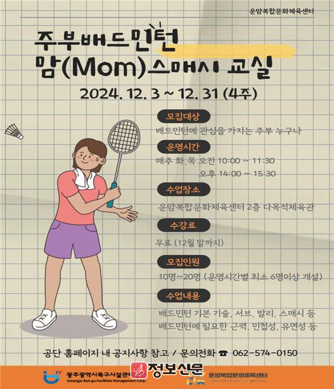 ![]() 광주북구시설관리공단, 주부 배드민턴 교실 맘(Mom) 스매시 수강생 모집 |