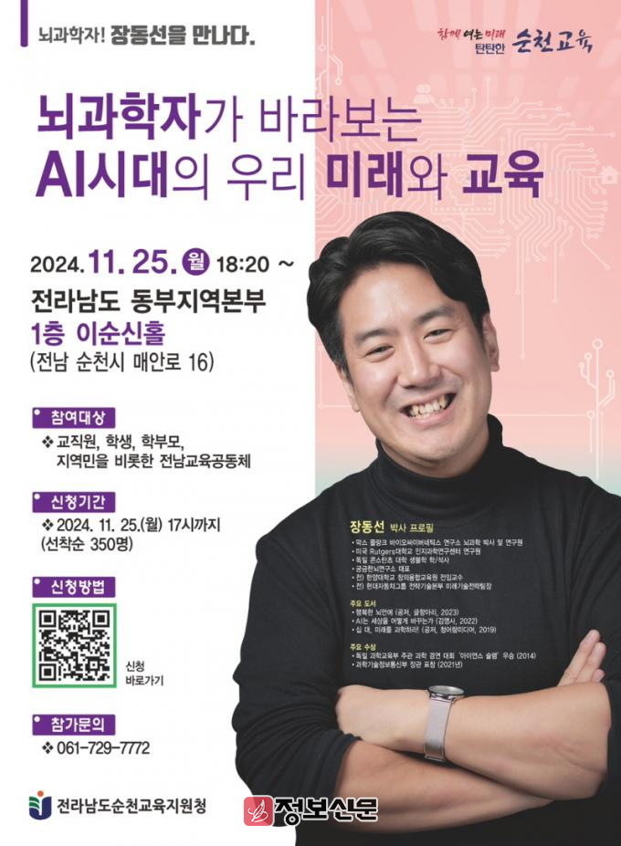 이번 특강 신청 기간은 포스터에 QR코드로 신청할 수 있고 자세한 사항은 순천교육지원청 미래혁신교육팀(061-729-7772)으로 문의하면 된다.