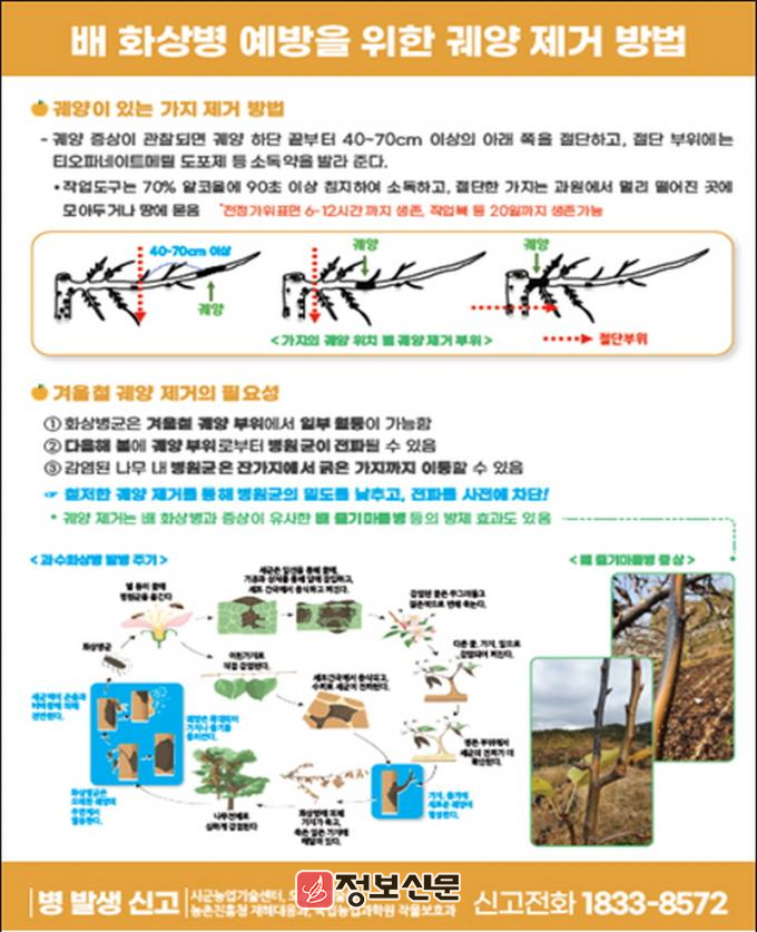 광양시는 ‘화상병 사전예방 중점기간’을 내년 4월 30일까지 운영할 방침이다. 올 한해 전국 6개도 21개 시군 710개 농가에서 화상병이 발생한 바 있고, 전북 무주까지 화상병이 발생한 만큼 주의가 필요한 상황이다.