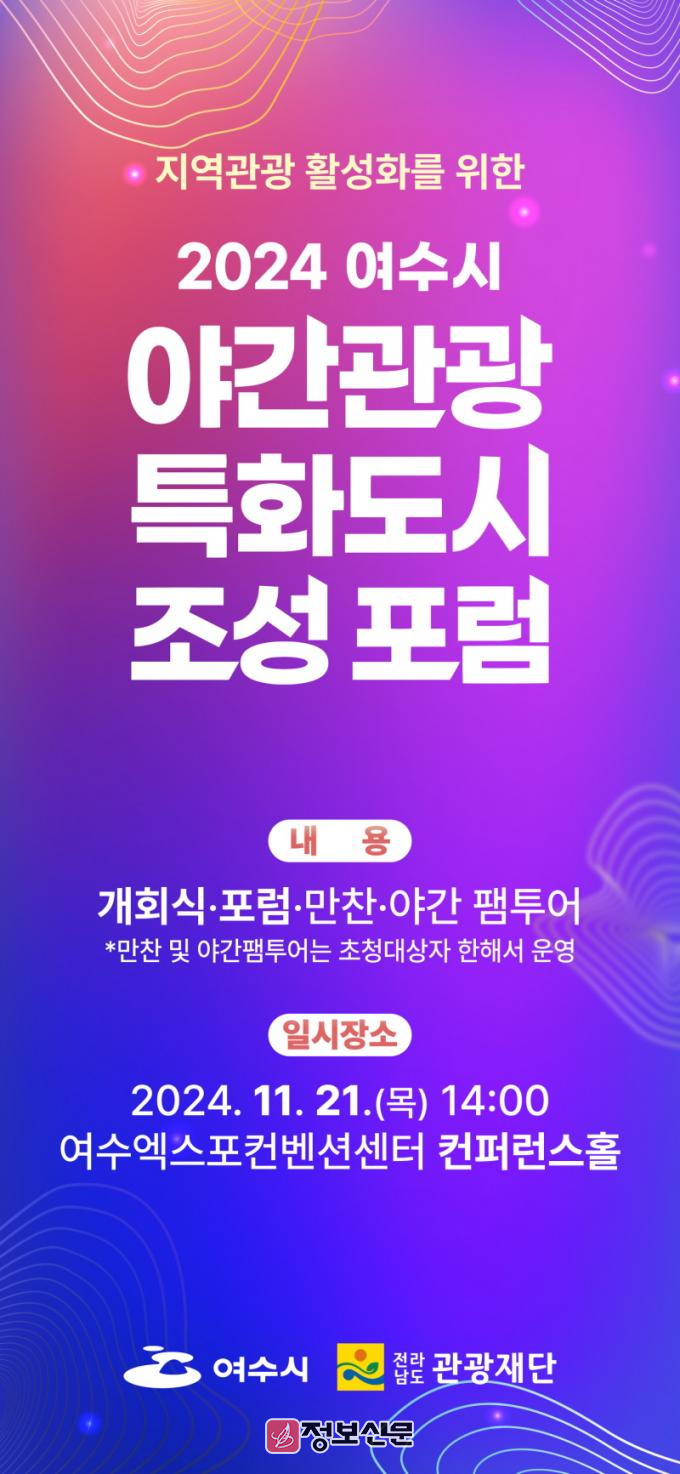 시 관계자는 “여수시는 오래전부터 야간관광을 미래 관광산업의 신성장 동력으로 인식하고 준비해 왔다”며 “이번 포럼에서 심도 있는 토론, 우수 지자체 사례발표 등을 통해 야간관광산업을 더욱 발전시켜 나가겠다”고 말했다.