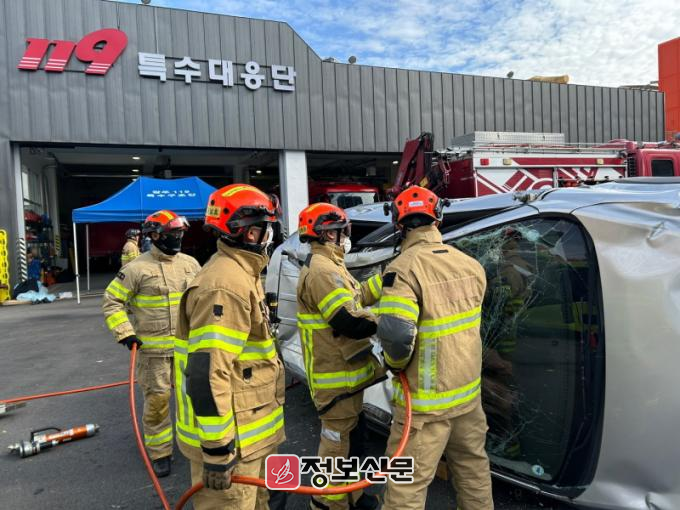 이번 훈련은 교통사고 차량 전복 등 특수상황을 재현해 차량 내 고립된 구조대상자에 대한 신속한 구조 등 인명구조 전문능력과 전기차 화재 대응 역량 강화를 위해 마련됐다.