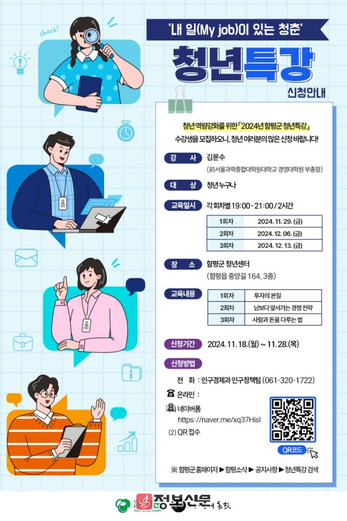 접수는 청년이면 지역에 상관 없이 누구나 가능하며, 오는 28일까지 함평군 홈페이지(함평군 홈페이지>함평소식>공지사항)에 기재된 QR코드를 활용하거나 전화(☎061-320-1722)로 신청하면 된다.