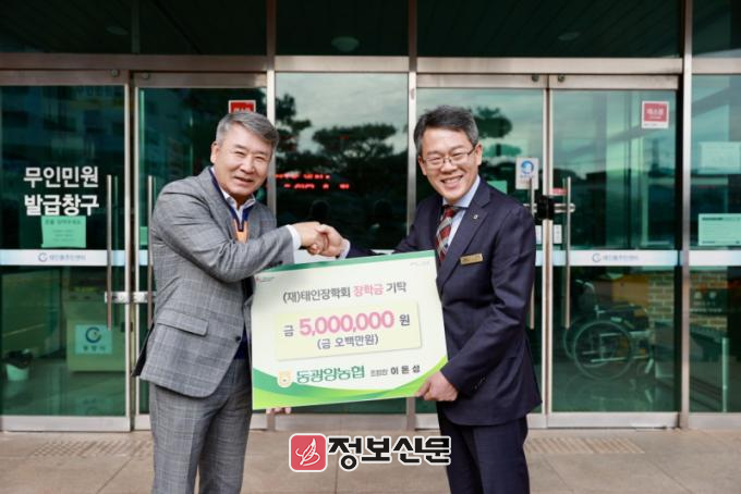 이날 기탁식에는 이돈성 동광양농협 조합장, 박권식 동광양농협 태금지점 지점장, 김영조 (재)태인장학회 이사장, 배록순 태인동장 등이 참석했다.
