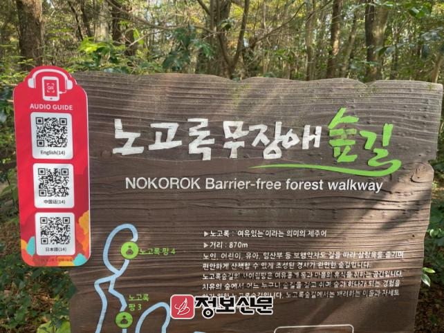 2019년 제작된 제주어(표준어) 숲길 안내 오디오북을 활용하여 4개 국어 오디오 QR코드 시스템을 12개의 숲길과 종합안내판 등에 설치 완료하였다. 이 사업은 금년도에 한국관광공사의 <2024 우수웰니스관광지 맞춤형 컨설팅 및 실행 지원> 사업의 일환으로 지원을 받아 구축하였다.