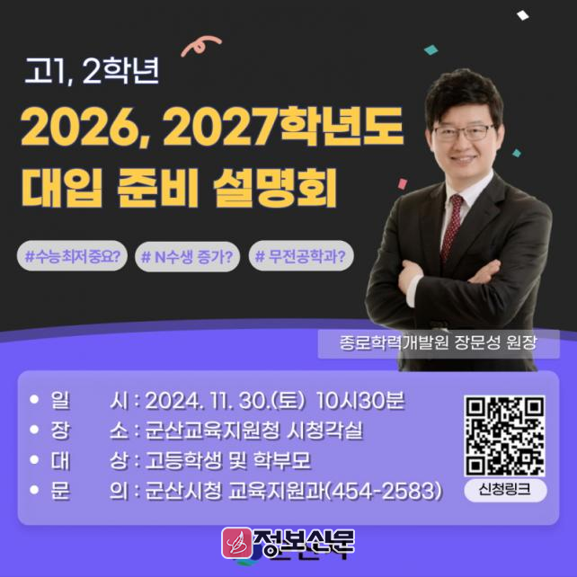![]() 군산시, 2026·2027학년도 대입 특강 개최 |