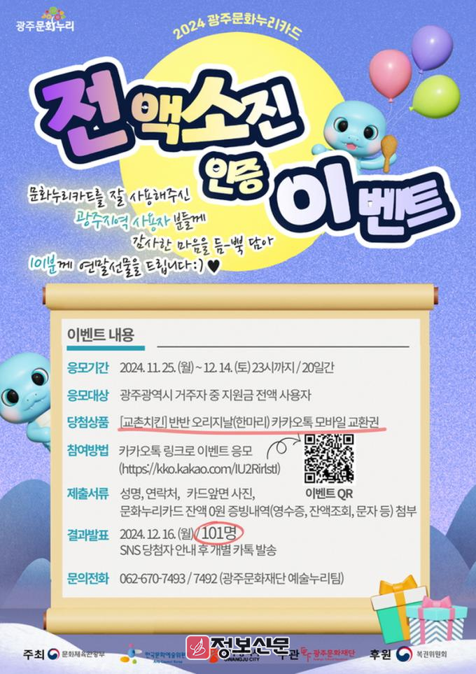 당첨자는 12월 16일 ‘광주문화누리’ 공식 블로그와 인스타그램·카카오톡 채널(광주문화누리카드) 등 사회관계망서비스(SNS)에 공지후 응모자 카카오톡 계정으로 기프티콘을 발송할 예정이다. 자세한 사항은 광주문화재단 예술누리팀(062-670-7492/7493)으로 문의하면 된다.