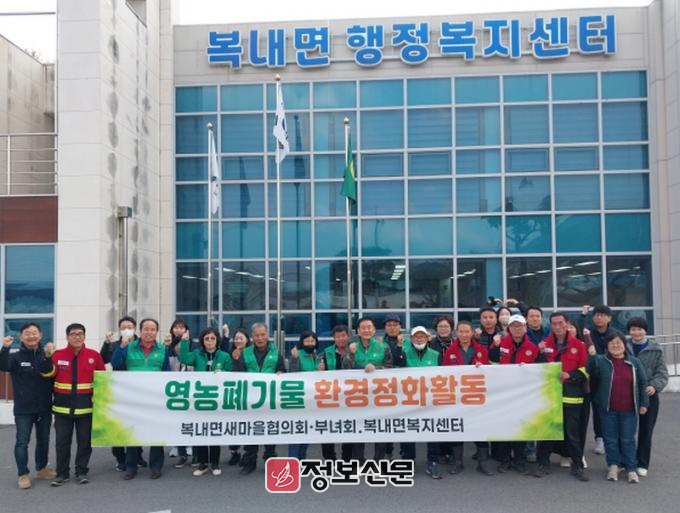이날 환경 정화 활동은 복내면 새마을부녀회, 새마을지도자회, 복내면 행정복지센터 직원 등 20여 명이 모여 함께했으며, 농로와 배수로 주변에 방치된 폐비닐을 집중 수거하고 주민들에게 쓰레기 불법 투기 방지 등 올바른 분리배출 방법을 홍보했다.
