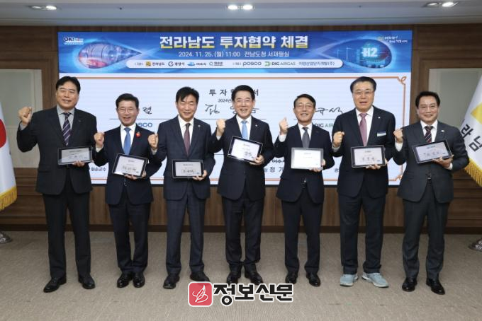 광양시는 25일 전남도청 서재필실에서 ㈜포스코, 광양시, 전라남도 간 투자협약이 체결됐다고 알렸다. 협약식은 김영록 전라남도지사, 정인화 광양시장, 이동렬 ㈜포스코 광양제철소장 등이 참석한 가운데 진행됐다.