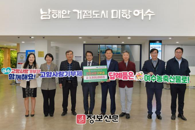 여수시(시장 정기명)에 따르면 NH농협 재경 여수시향우회원 29명이 고향을 응원하는 마음을 담아 마련한 고향사랑기부금 350만 원을 시에 전달했다고 밝혔다.