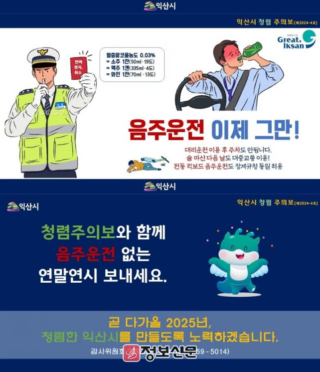 또한, 익산시는 연말연시 공직기강 특별점검을 진행해 △근무지 무단이탈 등 복무 위반 행위 △음주운전·성비위 등 품위손상 행위 △청탁금지법 위반 행위를 점검한다.