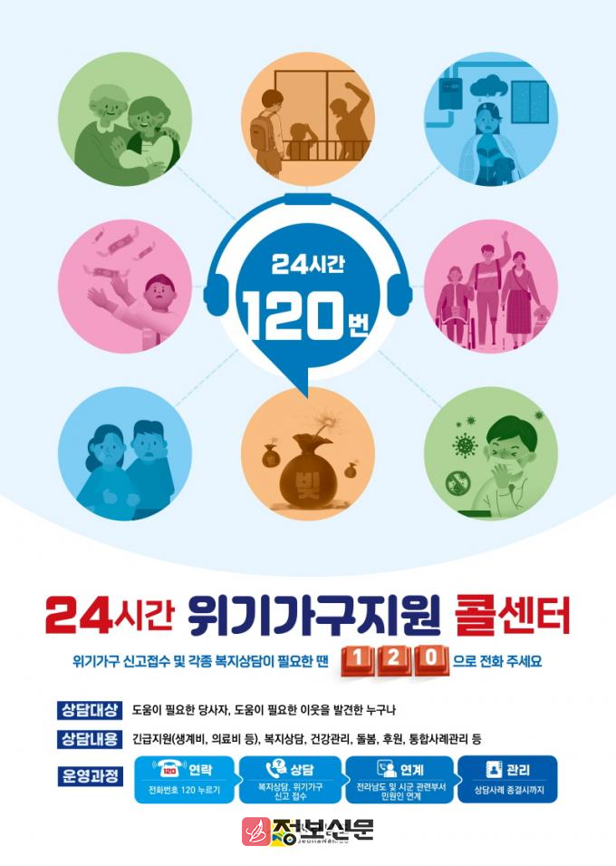 도민이 주변 생활이 어렵거나 도움이 필요한 취약계층을 발견하면 전남도 위기가구지원 콜센터(120번), 복지위기알림 앱을 통해 손쉽게 신고할 수 있다.