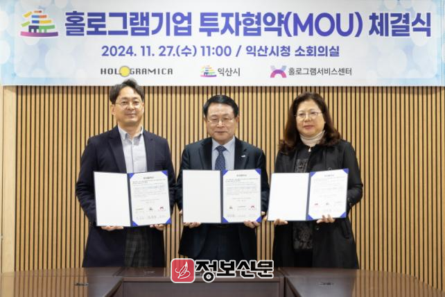 익산시는 27일 시장실에서 정헌율 익산시장을 비롯해 박창준 홀로그래미카 대표, 김수영 홀로그램콘텐츠서비스센터장 등 관계자들이 참석한 가운데 투자 협약을 체결했다.