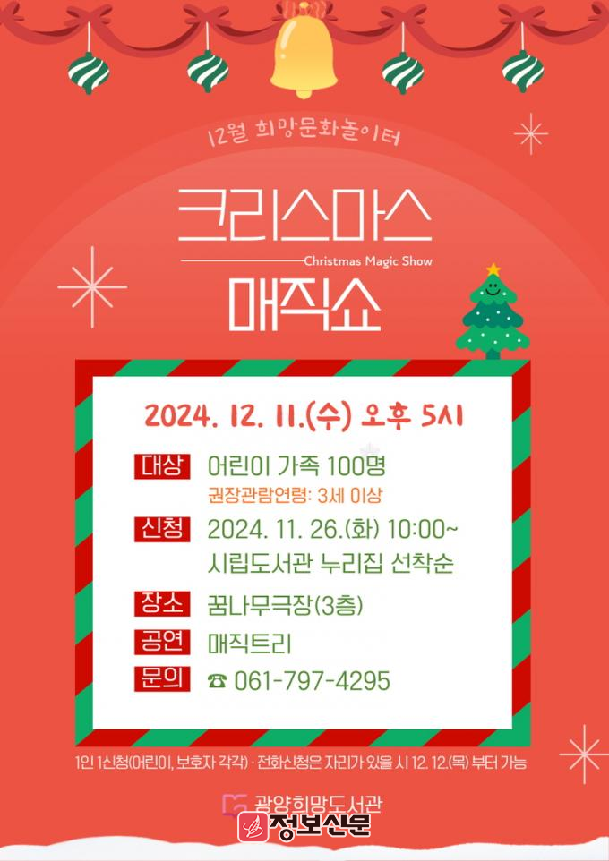 남수향 희망도서관팀장은 “한 해 동안 어린이들의 반응이 가장 좋았던 공연을 한데 모은 매직쇼와 크리스마스 이벤트를 준비했다. 광양희망도서관을 찾아 가족과 함께 따뜻한 연말 보내시길 바란다”고 말했다.