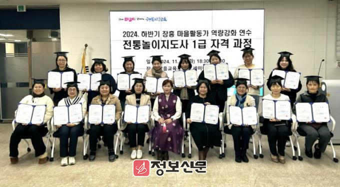 이번 연수는 장흥 관내 11개 마을학교에서 활동하고 있는 마을활동가들의 역량을 강화하기 위한 것으로 소통공감행복연구소 공혜경 소장을 강사로 전통놀이지도사 1급 자격 과정으로 운영하였는데 총 20명의 마을활동가가 수료하여 자격을 취득했다.