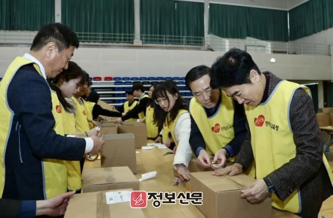 이날 김대중 교육감을 비롯한 도교육청 간부들은 실생활에 도움이 되고 학생들이 선호하는 신발을 선물로 준비해 정성들여 포장했다. 이날 포장된 선물은 우체국 택배를 통해 학생 가정으로 배송된다.