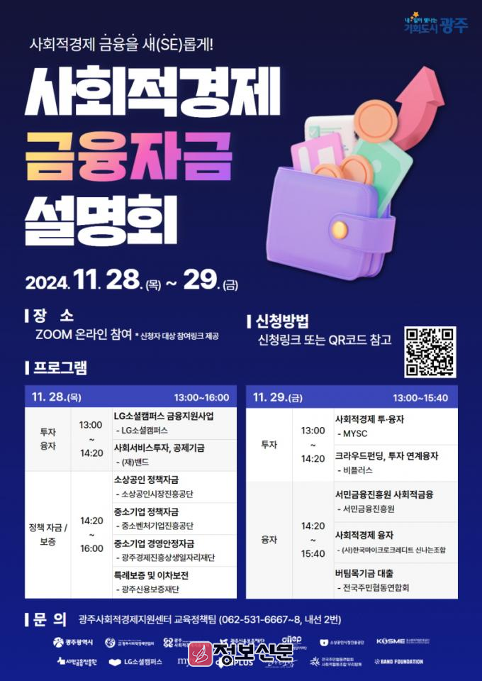 광주사회적경제지원센터 주관하는 이번 설명회는 (예비)사회적기업, (사회적)협동조합, 마을기업, 자활기업 등 사회적경제기업을 대상으로 하며, LG소셜캠퍼스, (재)밴드, 소상공인시장진흥공단, 중소벤처기업진흥공단 등 11개 금융기관이 참여한다.