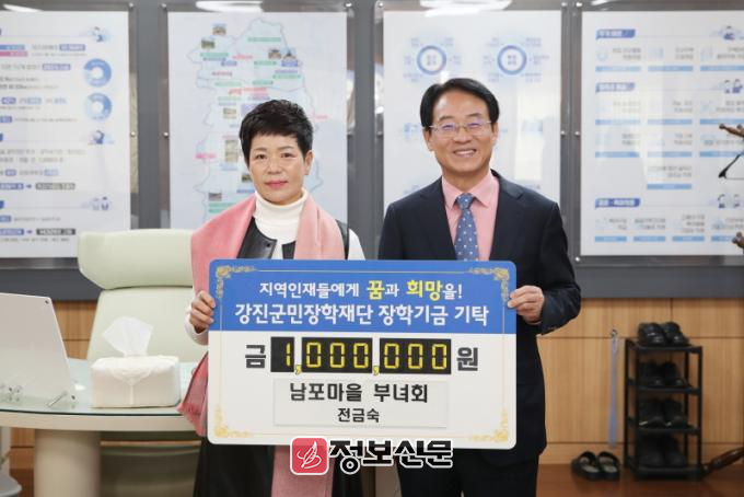 전금숙씨는 강진군어촌계연합회 방진석 회장 배우자로 남포마을 부녀회에서 강진만 춤추는 갈대 축제 수익금 가운데 100만 원을 힘들게 공부하는 강진군 학생들을 위해 장학금으로 내놓았다. 전씨는 “회원들과 함께 이룬 축제 수익금을 장학금으로 지원할 수 있어 기쁘게 생각한다”며 “학생들이 강진군을 빛낼 훌륭한 인재로 성장하길 바란다”고 말했다.