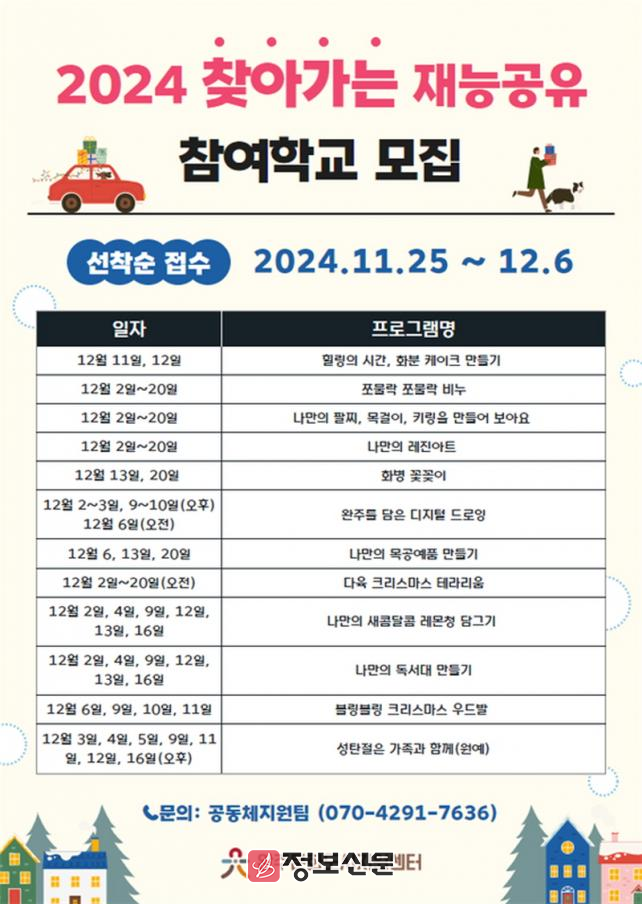 ![]() 완주문화도시지원센터, ‘2024 찾아가는 재능공유클럽’ 참여학교 모집 |