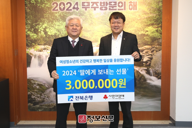 이날 물품 전달을 위해 무주군청을 방문한 전상익 부행장과 김성수 무주지점장은 “지역 대표 은행으로서 항상 지역사회 발전과 이웃들의 행복에 일조하고 싶은 마음”이라며 물품이 지역 내 저소득 여성 청소년들에게 잘 전달돼서 도움이 되고 또 더 많은 나눔과 기부문화를 확산하는 계기가 되길 바란다”라고 전했다.