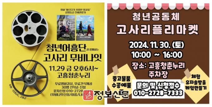 이번 행사는 청년어흥단(대표 남녀진) 주최로 진행되며, 29일(금)에는 무료 영화감상과 간식을 제공하는 ‘고사리 무비나잇’이 열리고, 30일(토)에는 중고 물품과 수공예품 등을 나누고 판매하는 플리마켓과 유자 솔방울 케이크만 들기 체험 등 가족 단위 행사도 함께 진행될 예정이다.