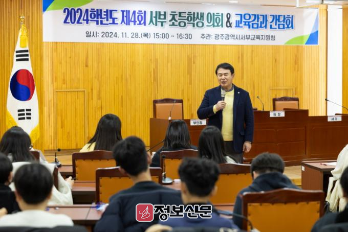 이날 이 교육감은 ‘제4회 서부 초등학생 의회’의 안건 중 하나인 ‘학생 놀 권리 보장’에 대한 의견을 주고 받았다. 학생들은 학교 내 놀이공간 확보, 철제 놀이기구 재질 교체, 중간 놀이시간 30분 확보 등의 의견을 제시했다.
