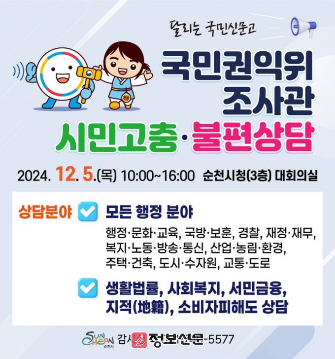 ![]() 순천시, 권익위 조사관 시민고충 불편상담 “달리는 국민신문고” 운영 |