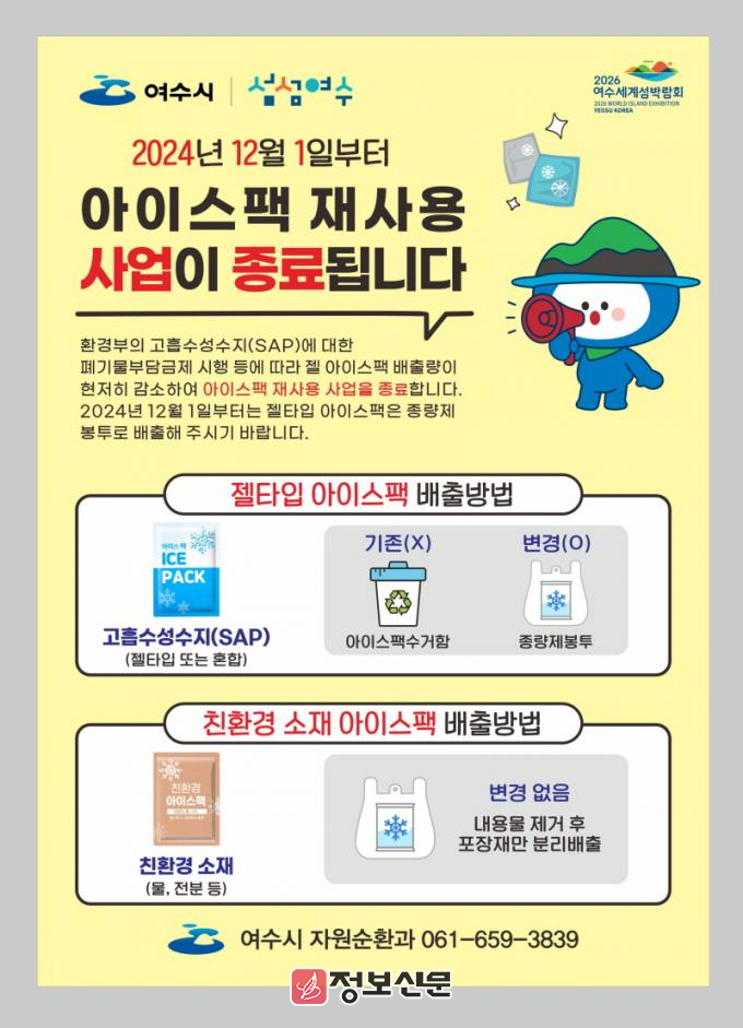 여수시 관계자는 “아이스팩 사용 후 올바르게 분리 배출하여 환경보호에 동참해 주시길 바란다”고 말했다.