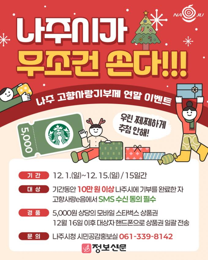 나주시(시장 윤병태)는 연말정산 시즌에 맞춰 12월 1일부터 15일까지 고향사랑기부제 참여 감사 이벤트를 진행한다고 29일 밝혔다.