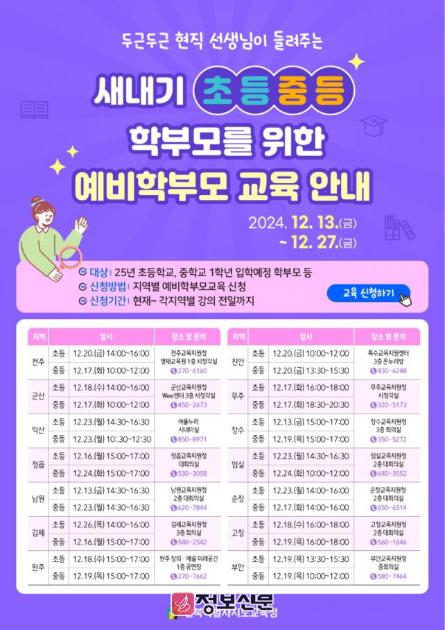 ![]() 전북특별자치도교육청, 맞춤형 지역별 예비 학부모 교육 진행 |