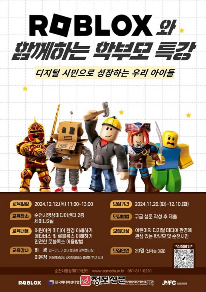 12일(목), ‘로블록스와 함께하는 학부모를 위한 디지털 시민의식 특강’에서는 어린이들이 많이 이용하는 몰입형 게임 및 창작 플랫폼 ‘로블록스’를 비롯한 디지털 미디어의 특징과 안전한 로블록스 이용 방법을 제공할 예정이다.