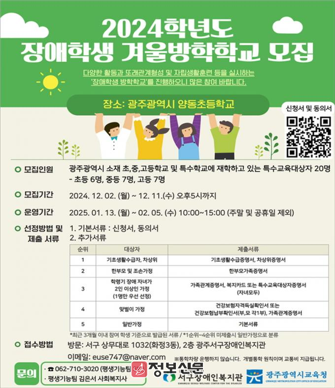 ![]() 광주서구장애인복지관, 2024학년도 장애학생 겨울방학학교 학생 모집 |